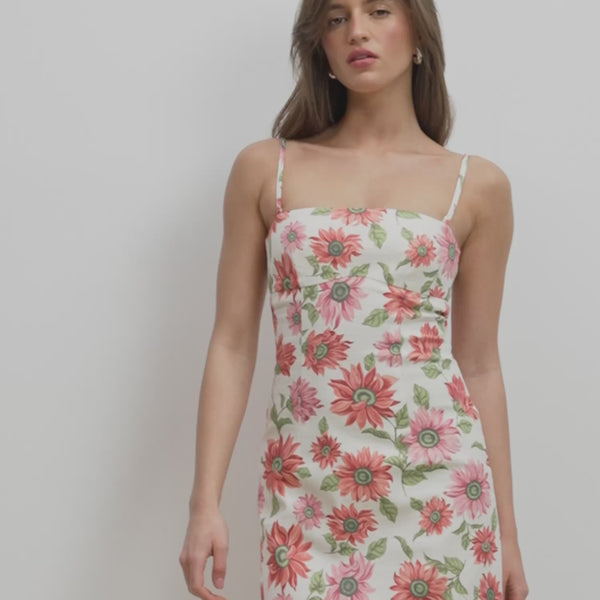 Midi-Kleid aus ecrufarbener Stretch-Baumwolle mit Sonnenblumenmuster und Trägern