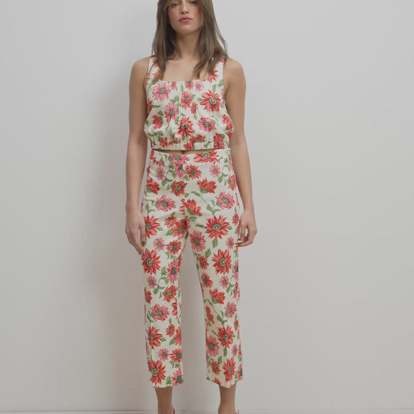 Ecrufarbenes, ärmelloses Crop-Top mit Sonnenblumenmuster
