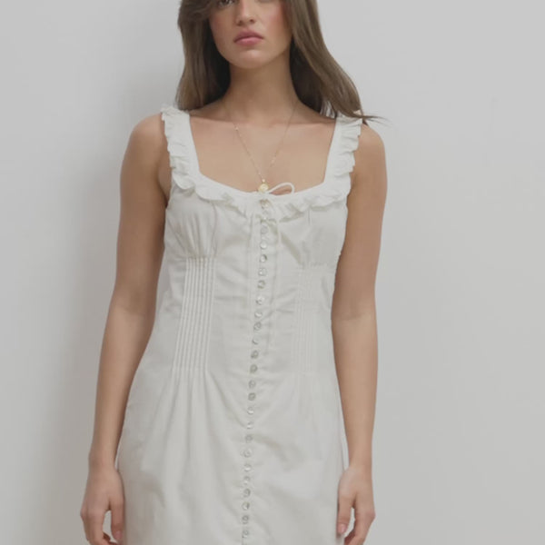 • Gerundeter eckiger Ausschnitt mit Volant und Bindeband