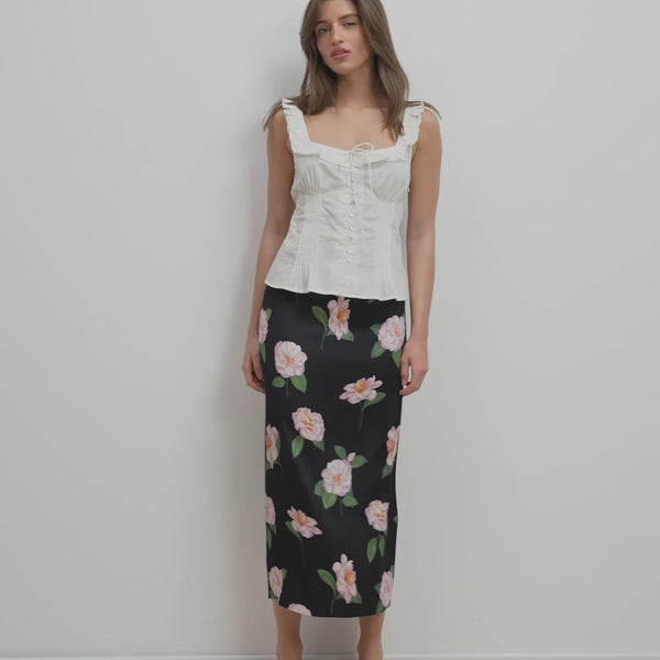 Midi-Bleistiftrock aus schwarzem, bedrucktem Stretch-Satin