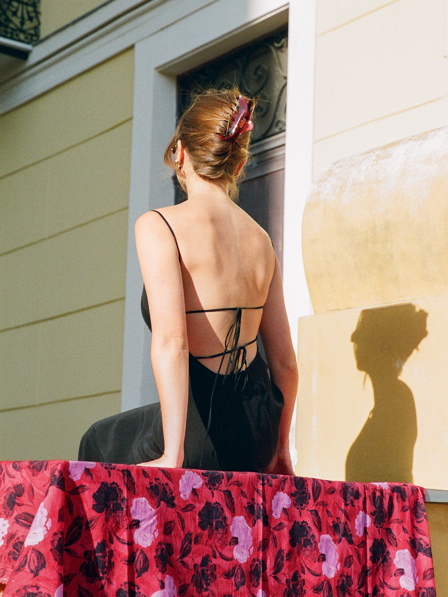 Moving between city streets and the coast, she is drawn to that deep blue where sky and sea become one. She wanders through shaded lanes and along sunlit promenades, carried by an effortless rhythm, a silhouette that captures the essence of the Rouje woman. For this second chapter of the summer collection, the lines evolve. A desire for escape inspires new fabrics and unexpected palettes, while a deep connection to our roots preserves the House’s iconic cuts and prints.