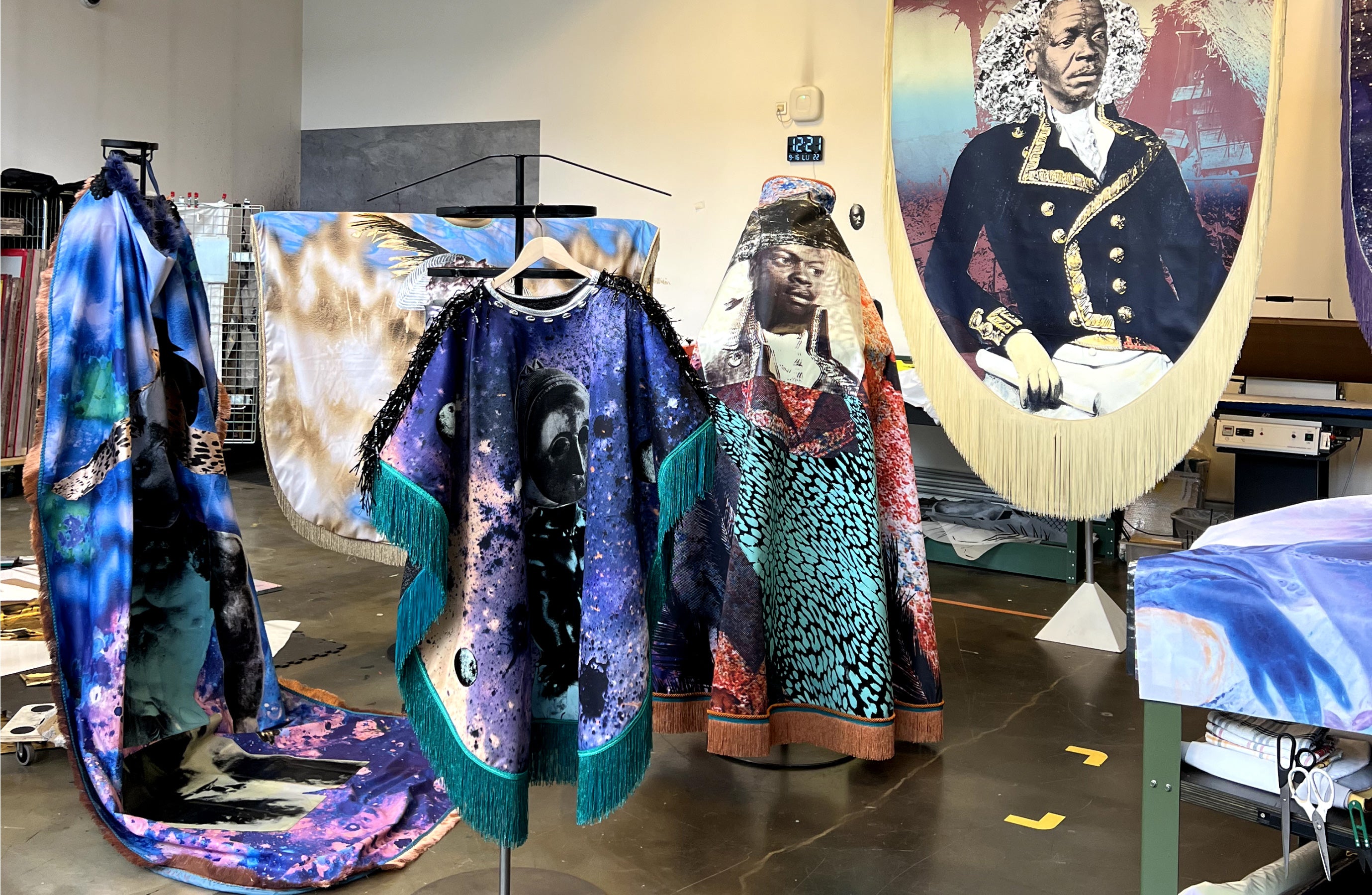 Baoulé Dancer and Allure Saint Maurice banner Screen and digital printing on leather and fabrics
