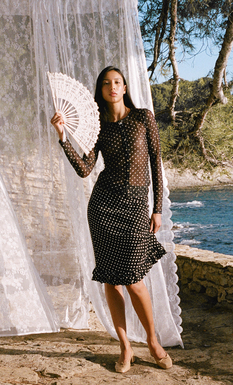 The Carmen polka dot drifts across sheer, ruffled skirts with a subtle nod to the ’90s.