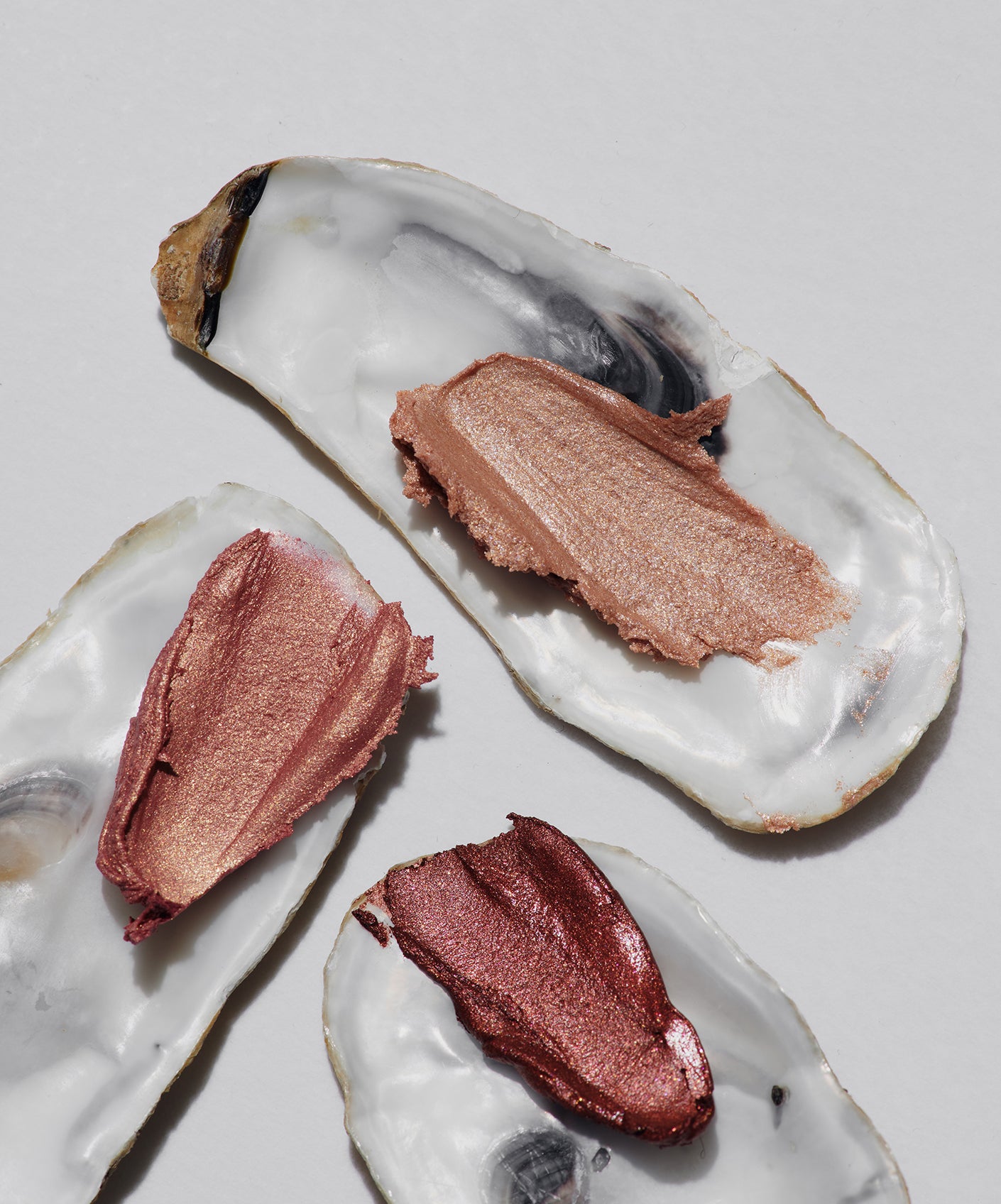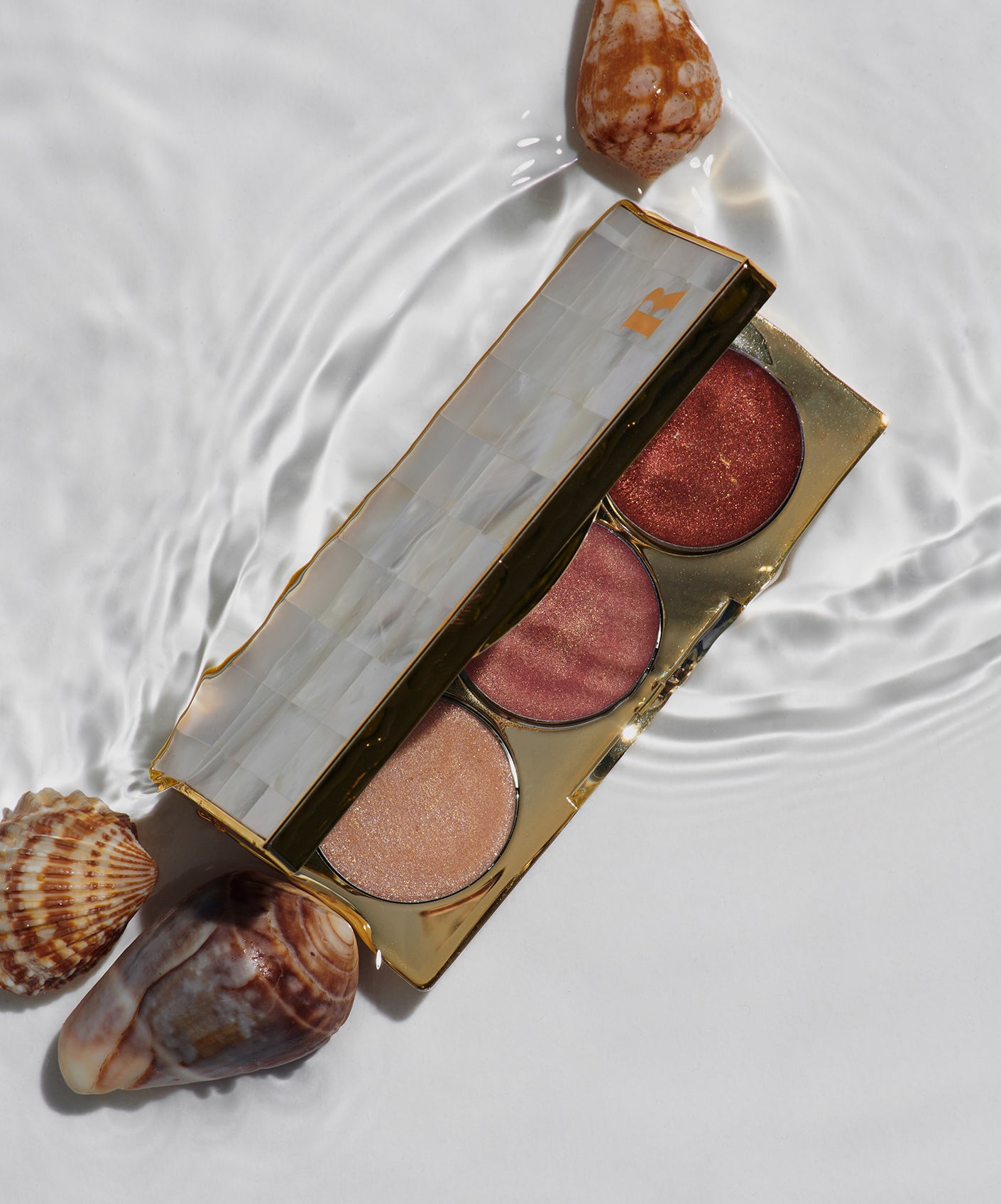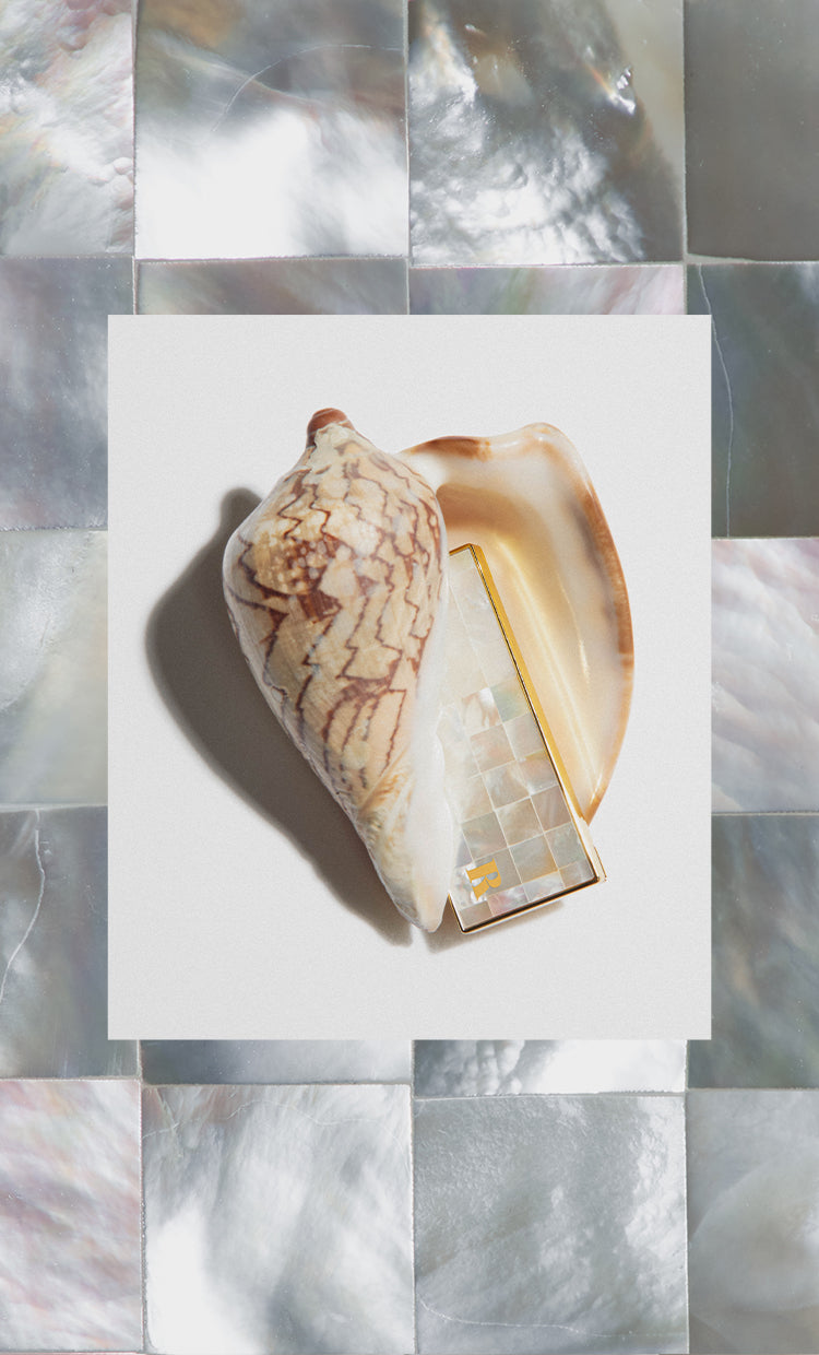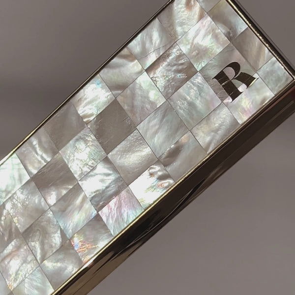 Three shimmering shades with buildable intensity, Gold, Rose Gold and Gleaming Copper, promise a crease-free finish. Ensconced within a vintage-inspired natural mother-of-pearl checkerboard case, poised to grace your bathroom countertop.