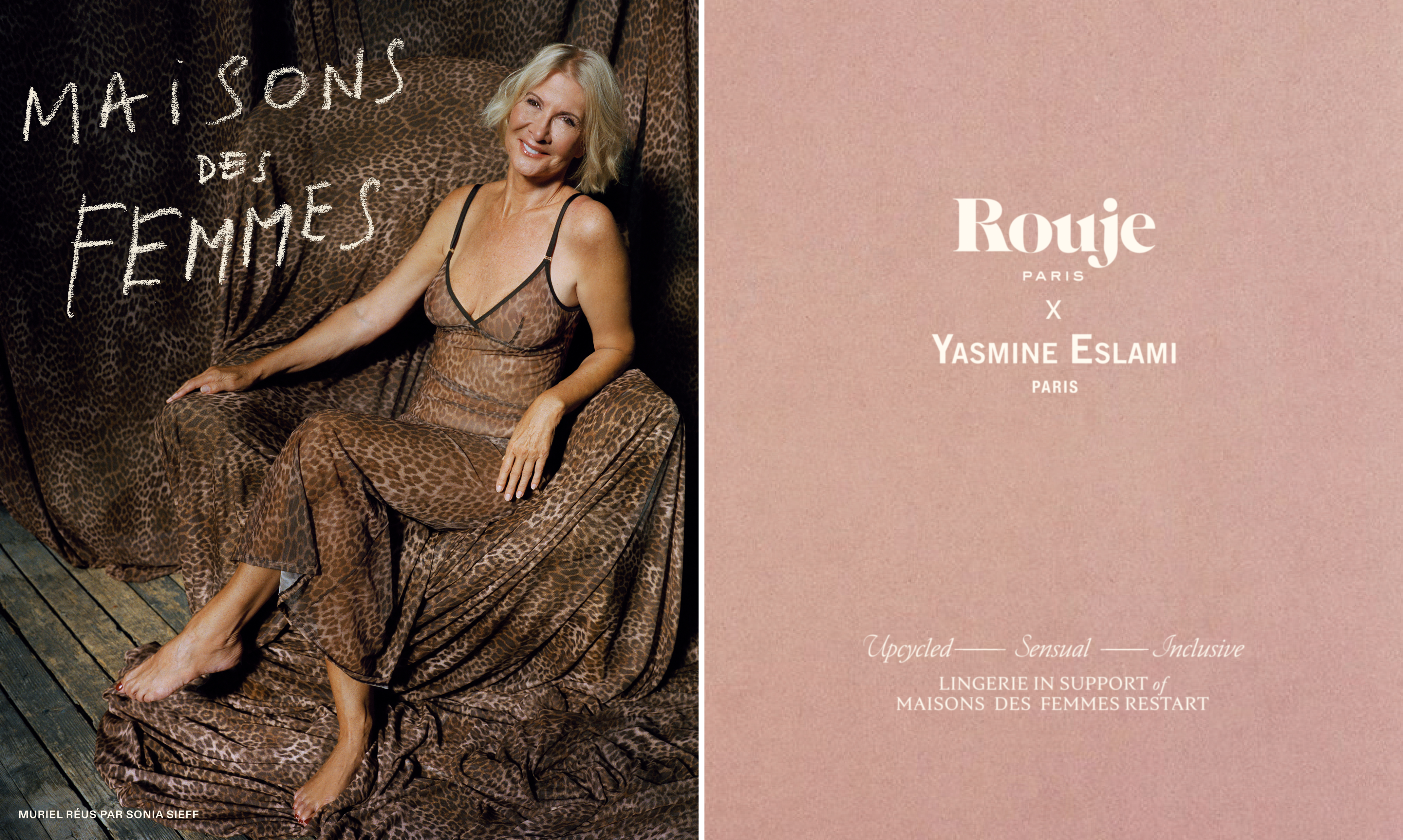 La capsule collection ripropone la linea iconica di Yasmine Eslami: tre completi e un abito sottoveste, realizzati con tessuti Rouje riciclati. Le stampe della maison aderiscono direttamente alla pelle, reinterpretate come capi intramontabili.